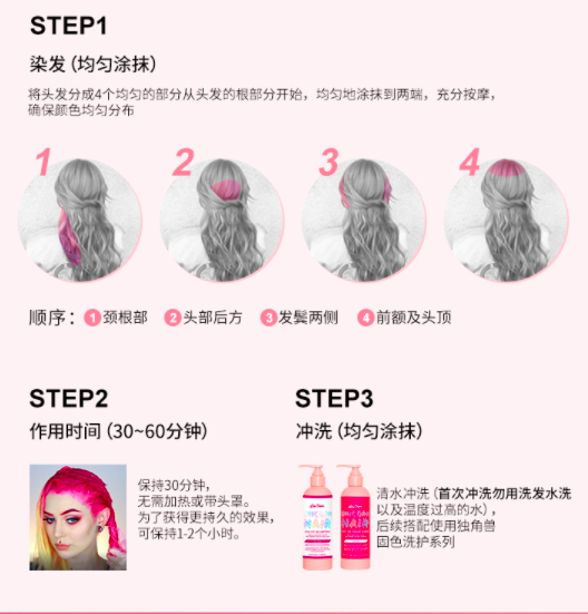 3.保持30分钟,无需加热或带头罩。为了获得更持久的效果,可保持1-2个小时,独角兽染发膏不含任何刺激性化学物质或漂白剂,因此不会损伤发质。之后用凉水或温水冲洗头发,直到感觉干净为止。